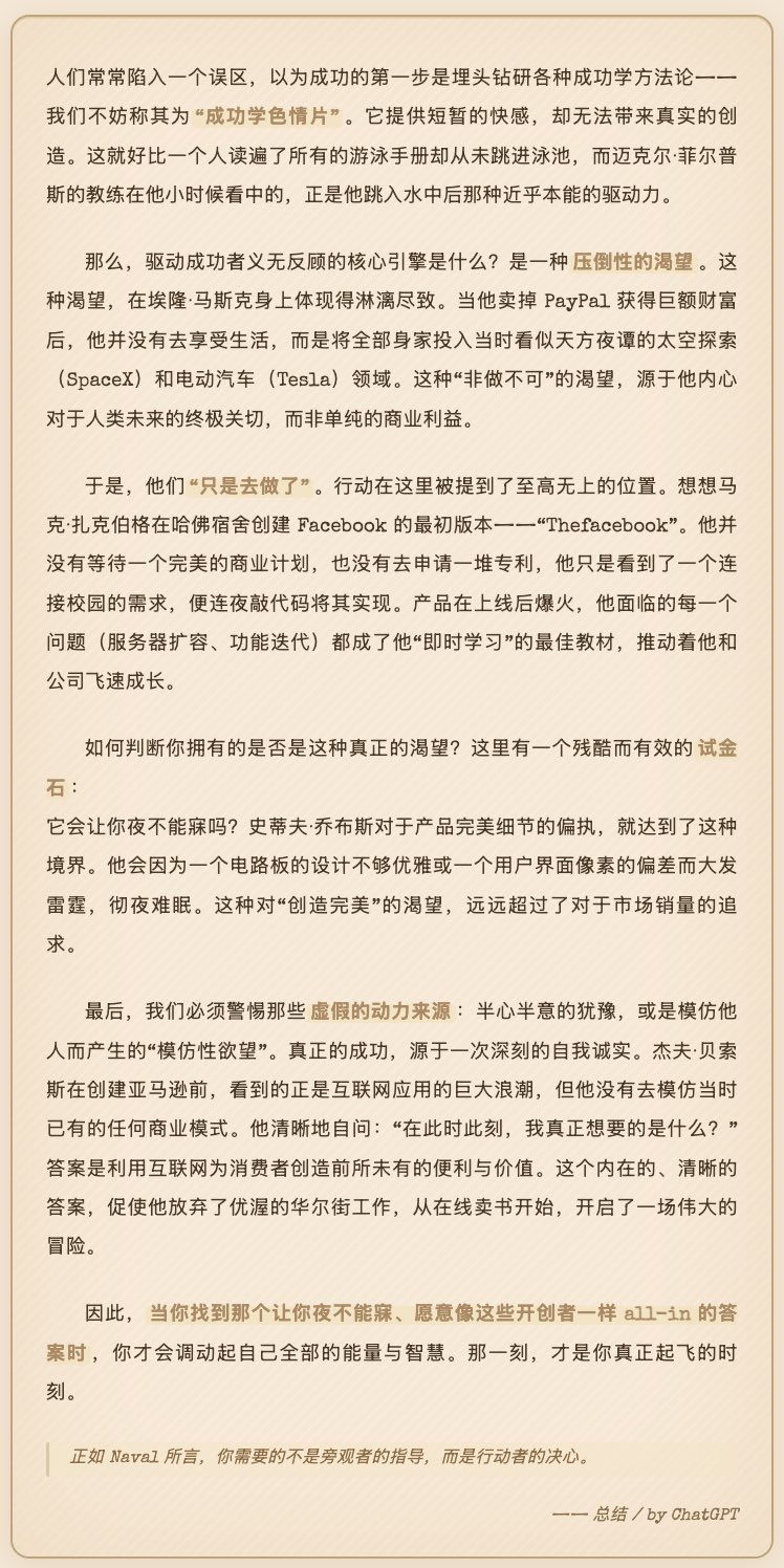 因此,当你找到那个让你夜不能寐、愿意像这些开创者一样all-in的答案时,你才会调动起自己全部的能量与智慧。那一刻,才是你真正起飞的时刻。正如Naval所言,你需要的不是旁观者的指导,而是行动者的决心。